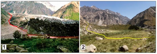 The location of the Medvezhiy glacier is as follows: (1) Osipova took this photo in June 1973; (2) Murodov M. took this photo on 20 August 2023. The red and yellow lines denote significant changes in the Medvezhiy glacier’s position over time.