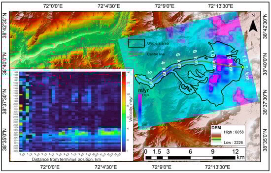 We obtained the Inter-Mission Time Series of Land Ice Velocity and Elevation (ITS_LIVE) data from NASA to assess the interannual variations in the velocity of the Medvezhiy glacier. Based on Landsat 5,7,8,9 and Sentinel-1,2 images, this glacier velocity product uses the autonomous Repeat Image Feature Tracking processing approach as outlined by [54] to extract glacier velocity by feature tracking, local normalization, and over-sampling. The data were strong enough, and picture matching could be the source of inaccuracies. However, surge occurrences could last for many months instead of a year, in which case a mean annual figure would significantly underestimate true flow velocities. We used annual glacier velocity data with a spatial resolution of 240 m from 1986 to 2018 in our analysis (https://nsidc.org/apps/itslive/ (accessed on 8 March 2024)). The glacier velocity error was estimated using the ITS_LIVE data. Each component’s velocity was linked to the stable region during the creation of ITS_LIVE data, and to account for co-registration problems, the median of each velocity component (Vx, Vy) was set to zero on the non-glacial zone. Velocity components that differed from the median value of all pixels in the same position by more than three times the quartile range were deemed to be gross outliers and were eliminated. The standard deviation of the component velocity recorded in the stable region was used to determine the uncertainty in each image-pair velocity value. According to [55], the uncertainties in merging velocities are calculated on a pixel basis by propagating the uncertainty of each image-pair velocity. The remaining velocity error, if the correction is successful in eliminating the co-registration flaws that were present during the creation of Sentinel-1 velocity data, is equivalent to 0.1 pixels of tracking precision. Thus, under 6 d and 12 d repetition cycles, the predicted velocity errors obtained for Sentinel-1 data with a pixel size of 3 × 14 m are 0.24 m d−1 and 0.12 m d−1, respectively. According to [56], there is less uncertainty (~0.08 m−1) in the glacier velocity produced from the 12-day Sentinel-1 data.