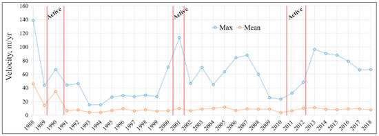 The velocity of the Medvezhiy glacier, measured in meters per year (m/year), has been observed from 1988 to 2018 as part of IT’S LIVE (https://nsidc.org/apps/itslive/; accessed on 10 January 2023). The data records the maximum velocities of the glacier for each year during this period, revealing fluctuations in its movement. A significant increase in velocity was recorded in 1988, reaching 138.9 m/year, which is substantially higher than the previous and succeeding years. Notably high velocities were observed in 2001, 2007, and 2013 at 113.8 m/year, 88.1 m/year, and 96.7 m/year, respectively, marking periods of rapid movement (Figure 6 and Figure 7). On the flip side, the slowest speeds were documented in 1993 and 1994, both at 4.13 m/year, followed by 2000 at 6.61 m/year and 2002 at 6.63 m/year, and with 2010 exhibiting notably lower velocities under 3.59 m/year. This variation indicates that the Medvezhiy glacier experienced both accelerated and reduced movement over the observed time frame.