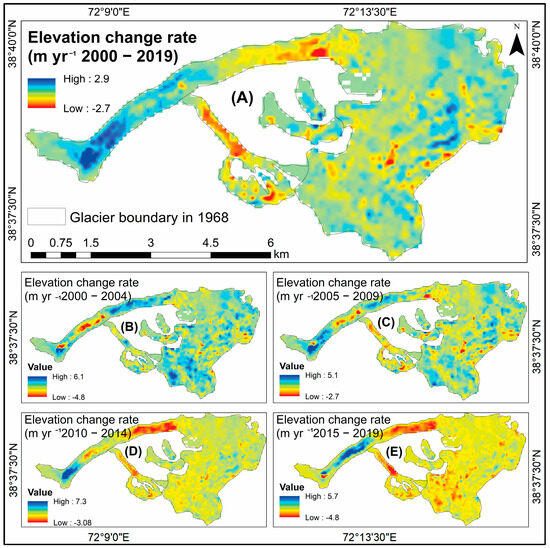 Surface elevation change of Medvezhiy glacier from 2000–2019 m/year−1. Subfigure (A) provides an overview of the glacier’s elevation change throughout the entire period. Subfigures (B–E) zoom in on specific time intervals: 2000–2004, 2004–2009, 2010–2014, and 2015–2019, respectively. Cool colors indicate positive mass balance, whereas warm colors indicate negative mass balance.