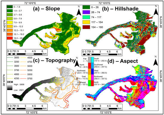 An illustration of the Medvezhiy glacier using: (a) slope, (b) hillshade, (c) topography, and (d) aspect.