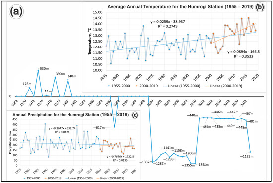 Additionally, an analysis of temperature and precipitation changes based on data from the Humrogi station revealed an increase in air temperature and a decrease in precipitation after 2000 (refer to Figure 10b,c). This indicates an insufficient amount of snow in the glacier accumulation zone, resulting in an inadequate increase in mass due to climate change. Therefore, monitoring the full surge cycle is beneficial for further understanding the mechanism of glacier surges. We anticipate that future research will enhance the monitoring of recurring glacier surges. The observed changes in climatic data found that in this area, the decrease in annual precipitation was 32.9 mm or 14% from the annual precipitation amount. Following a thorough analysis of the average annual air temperature and annual precipitation data from the Humrogi station, it became apparent that post 2000, there was a notable increase in air temperature alongside a decrease in precipitation in the study area. These trends contribute to an accelerated process of glacier degradation. When comparing the air temperature to the glacier movement, the picture more vividly displays their correlation. In order to determine the dependence of the surge of the Medvezhiy glacier’s terminus position on meteorological conditions (atmospheric precipitation and air temperatures), graphs of glacier surge and changes in meteorological conditions were constructed for the observation periods.