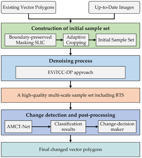 Most existing change detection algorithms rely heavily on image contrast and require high-quality training samples, which are often challenging to acquire. This limitation impedes their effectiveness in large-scale practical change detection scenarios. In this work, we propose a novel framework for detecting changes in vector polygons using high-resolution RS images, as illustrated in Figure 2. Our framework comprises an end-to-end processing architecture consisting of four primary stages. Initially, we employ a boundary-preserved masking SLIC [45] algorithm for image superpixel segmentation, leveraging high-resolution RS images and land cover vector data as inputs. Subsequently, adaptive cropping is performed on each superpixel unit to generate initial samples, which undergo denoising via the EViTCC-DP method, and the inclusion of representative training samples (RTS) is introduced to construct the final high-quality training sample set. These refined samples are then subjected to fine-grained image classification through an improved attention-based multi-scale ConvTransformer network (AMCT-Net). Finally, a change decisionmaker applies various rules to detect and locate changes within vector polygons. A detailed elaboration of each module will be provided subsequently.