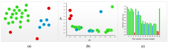 Graph example illustrating the fundamental concept of the DP clustering algorithm. (a) Distribution of the scene samples belonging to different classes. (b) The relationship between relative distances and local densities of the scene samples. (c) Local densities of the scene samples. Different colors represent different classes of the scene samples.