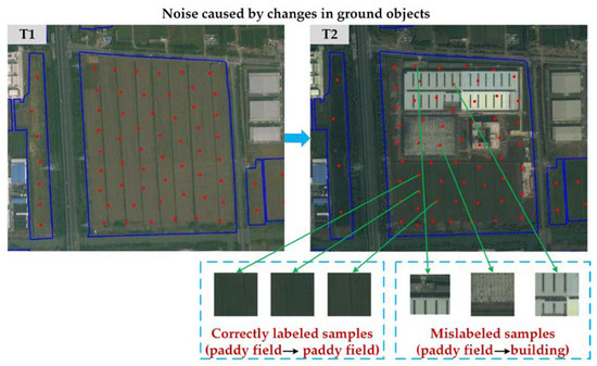 To address the challenge of difficult sample acquisition, Zhao et al. [11] utilized linear spectrum hybrid analysis and spectral index method to extract ground object samples in an attempt to tackle sample selection difficulties in deep learning classification. Cui et al. [12] determined the optimal focus radius for different land types based on focus statistics and unique phenological characteristics, and subsequently proposed an approach for the automatic generation of training samples using an enhanced distance measure. Cao et al. [13] introduced a comprehensive fused cross-task transfer learning method (FFCTL) that effectively utilizes crowdsourced building data and high-resolution satellite images to address the issue of expensive real samples in building change detection. Lv et al. [7] presented an iterative training sample augmentation (ITSA) strategy combined with a deep learning neural network to enhance change detection performance. Li et al. [14] developed a label-noise active learning sample collection method for multi-temporal land cover classification. However, these studies did not consider the uncertainty inherent in the training data, which may introduce errors into the final results. Therefore, addressing the denoising problem associated with training samples is crucial for accurate change detection [15].