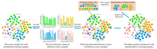 Sample denoising plays a crucial role in acquiring high-quality training samples, thereby enhancing the classification accuracy of the model [50,51]. Consequently, this paper introduces the EViTCC-DP approach, as illustrated in Figure 9. The approach comprises the following steps: