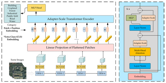 The proposed AMCT-Net adopts a Siamese structure for local feature extraction, comprising four Encoder Residual Modules (ERMs) that generate feature maps of varying sizes with channel dimensions of 16, 32, 64, and 128, respectively. Subsequently, to enhance model performance, we incorporate an attention mechanism known as the Efficient Convolution Spatial Attention Module (ECSAM) at the backend of ERM. ECSAM prioritizes channel features and effectively leverages low- and high-level features [54]. Finally, ECSAM feature maps of different sizes are transformed into flattened feature patch tokens with uniform shapes. Similar to the original Transformer [55], we flatten the patches and map them to D dimensions using a trainable linear projection. We refer to the output of this projection as the patch embeddings. Position embeddings are added to the patch embeddings to retain positional information. The resulting sequence of embedding vectors is utilized as input to the Adapter-Scale Transformer Encoder for classification, facilitating the extraction of global features. Following an overview of the general motivation and architecture of our proposed method, we proceed to describe each main improved module in detail.