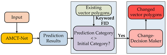 - To enhance fine-grained scene classification precision, we employ an improved attention-based multi-scale ConvTransformer network (AMCT-Net) for superpixel cropping unit classification. By integrating a CNN structure and Transformer, along with the attention mechanism module, we achieve a more discriminative feature representation, enhancing the model’s classification accuracy. Additionally, we introduce a change decisionmaker with various rules, which synergistically combines and post-processes sample predictions with land cover vector data to effectively extract changed vector polygons.