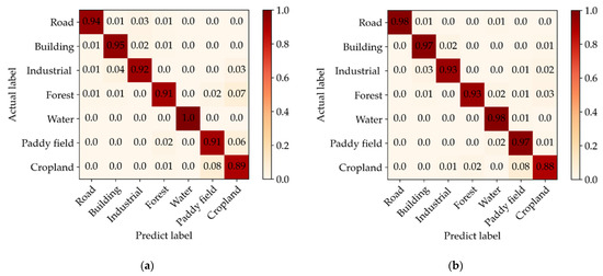 We utilized artificially generated reference data [see Figure 17b,d] to further visually assess the model’s detection accuracy. Table 5 presents the detection outcomes of the model on the two datasets. Excluding RTS, the model achieved precision and recall rates of 88.22% and 91.41%, respectively, in change detection for the Nantong dataset, as well as achieving precision and recall rates of 89.97% and 92.13%, respectively, for the Guantan dataset. Interestingly, including RTS improved precision by 2.11% and 1.09% on the Nantong dataset and Guantan dataset, respectively, while maintaining consistent recall due to its high-value information, which is conducive to change detection.