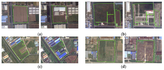 The sources of noise samples primarily encompass the following aspects. Firstly, they encompass discrepancies between vector boundaries and actual ground object boundaries due to variations in operating personnel and standards contribute to noise generation, as shown in Figure 7. Secondly, the formation of vector survey results often takes a certain time period, leading to disparities between land class attributes derived from vector polygons and those obtained from high-resolution RS images (see Figure 8). Consequently, it is not feasible to directly extract labeled samples for training solely based on vector polygons depicted on high-resolution RS images. In view of this, DP clustering is introduced for initial samples denoising with the aim of addressing the issue of automatic sample set construction.