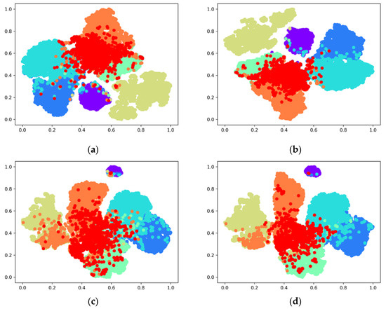 In order to enhance the visualization of the denoising effect, t-SNE [60] analysis was employed to assess the discriminability of high-dimensional sample features before and after denoising, as depicted in Figure 21. Each dot represents a distinct class, with increased clustering among dots of the same class indicating reduced noise levels. As illustrated in Figure 21, samples exhibit a more compact distribution within each class after denoising, leading to improved homogeneity and facilitating model training.