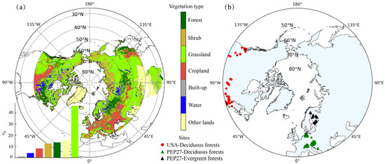 Spatial distribution of land cover (a) and phenological observation sites (b) in the study area. The histogram in the bottom left corner (a) represents the regional proportions of different land cover types. The vegetation types at the phenological observation sites are primarily evergreen and deciduous forest.