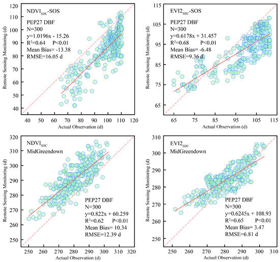 We employed ordinary least squares linear regression models to establish the relationship between actual phenological observation and remote sensing vegetation index retrieval phenology. To evaluate the accuracy of vegetation index retrieval phenology, we utilized regression measurement statistics, including root mean square error (RMSE), R-squared (R2), and bias [60,61,62]. The smaller RMSE and bias indicate that the phenology retrieved by the remote sensing vegetation index is closer to the actual observed phenology, while the larger R2 indicates that the model has stronger explanatory power, that is, the use of the remote sensing vegetation index can better reflect phenological changes. The formula is as follows: