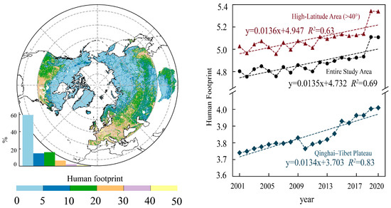 The average spatial distribution and interannual variation of the human footprint in the study area. The left panel illustrates the average spatial distribution of the human footprint from 2001 to 2020. The right panel represents the interannual variation of the human footprint. The histogram in the left panel represents the proportion of different human footprints.