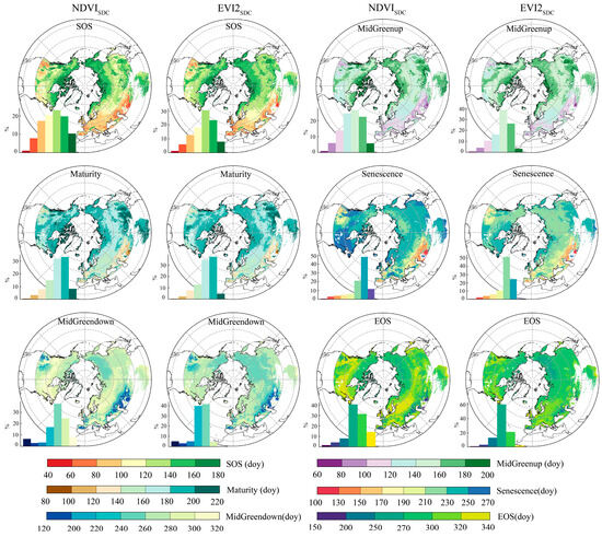 The spatial distribution of multi-year average phenological parameters retrieved by NDVISDC and EVI2SDC in HLAR from 2001 to 2022. Histograms depict the frequency distribution of corresponding phenological dates. The LOS can be found in Figure S4.