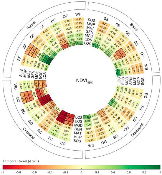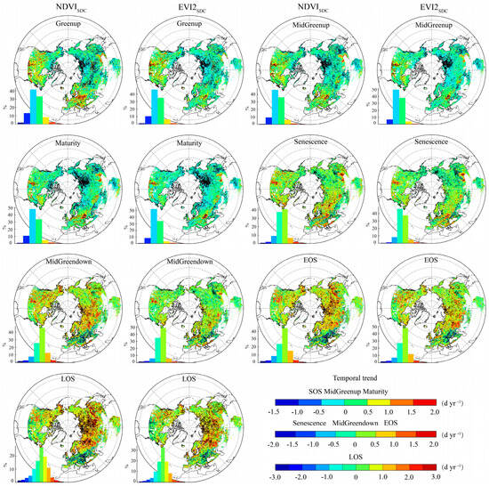 The LSP retrieved by NDVISDC and EVI2SDC showed no significant difference in the trend change (Figure 5). The trend of the SOS, MidGreenup, Maturity, and Senescence is mainly characterized by advanced phenology (advanced trends ratio (significant advanced trends ratio): 58.73–72.85% (10.29–17.58%) for NDVISDC, 67.66–76.5% (12.48–18.23%) for EVI2SDC). The trend of the MidGreendown and EOS is mainly characterized by delayed phenology (delayed trends ratio (significant delayed trends ratio): 58.47–61.72% (10.49–11.29%) for NDVISDC, 52.89–59.36% (11.28–12.35%) for EVI2SDC), as shown in Table S3. The overall LOS is mainly extended (extended trends ratio (significant extended trends ratio): 65.01% (18.06%) for NDVISDC, 65.20% (17.33%) for EVI2SDC). The LOS for NDVISDC and EVI2SDC is extended by 0.11 d yr−1 and 0.13 d yr−1, respectively.