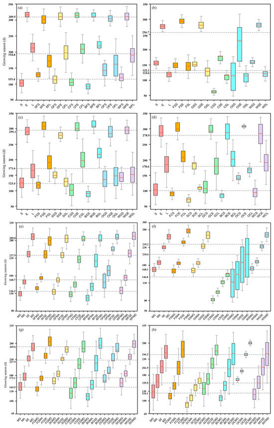 The phenological differences of LSP based on the NDVISDC for LULCC in forests (a,e), shrubs (b,f), grasslands (c,g), and croplands (d,h). In panels (a–d) and (e–h), the first three or four boxplots represent the phenology under native vegetation. These boxplots are labeled using abbreviated phenological parameters. The naming rule of the remaining abscissa names is that the land cover type represented by the first letter (S: shrub, G: grassland, C: cropland, B: build-up, O: other land, W: water) is transferred to the land cover type represented by the second letter. The third letter or the third and fourth letters represent phenological parameters (S: SOS, E: EOS, L: LOS, MG: MidGreenup, MA: Maturity, SE: Senescence, MD: MidGreendown). The gray dotted line from top to bottom represents the average EOS, LOS, and SOS (a–d) under different LULCC patterns, as well as the average MidGreendown, Senescence, Maturity, and MidGreenup (e–h). The phenological differences of LSP retrieved by EVI2SDC are shown in Figures S7 and S8.