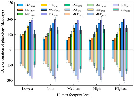 Within the lowest and highest levels of human footprint, the differences in LOS for NDVISDC and EVI2SDC are 58.84 d and 67.13 d, respectively. MidGreenup, Maturity, and Senescence occur earlier with the increasing gradient of human footprint. Within the lowest and highest levels of human footprint, the differences in these phenological parameters for NDVISDC (EVI2SDC) are 36.44 d (38.28 d), 26.44 d (29.68 d), and 16.85 d (18.22 d), respectively.