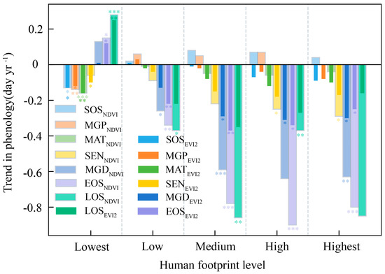 The trend of LSP under different human footprint levels. Symbols *, **, and *** represent the significance levels at 95 % (p < 0.05), 99 % (p < 0.01), and 99.9 % (p < 0.001), respectively. The NDVI and EVI2 for each phenological parameter refer to the NDVISDC and EVI2SDC datasets, respectively.