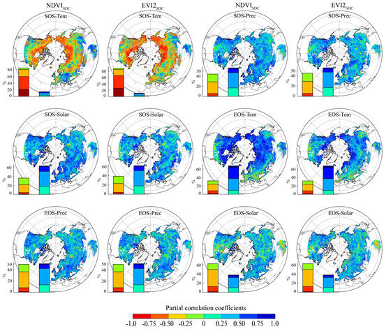 Spatial distribution of the partial correlation coefficients between phenological patterns (SOS and EOS) and climate variables (temperature, precipitation, and solar radiation) over the HLAR. The histograms represent the frequency distribution of the corresponding partial correlation coefficients.