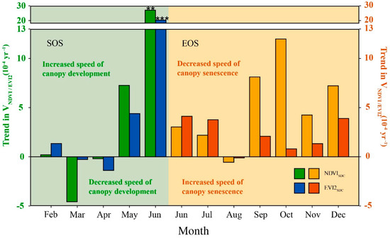 Monthly trends in VNDVI/EVI2 for SOS and EOS. Symbols ** and *** represent the significance levels at 99% (p < 0.01) and 99.9% (p < 0.001), respectively.