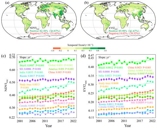 Based on the NDVISDC and EVI2SDC datasets, we conducted a trend analysis of NDVISDC and EVI2SDC from 2001 to 2022 at the global scale and in several typical regions. The results indicate that NDVISDC and EVI2SDC have 82.38% and 85.98% of the pixels showing a positive growth trend, and the proportion of significant pixels is 54.87% and 61.67%, respectively (Figure 12). Global NDVISDC (EVI2SDC) increased at a rate of 0.011 (0.008) decade−1. The greening rate in the Northern Hemisphere is higher than that in the Southern Hemisphere (NDVISDC: 0.013 vs. 0.006 decade−1; EVI2SDC: 0.009 vs. 0.008 decade−1). Among the continents (Figure S23), Europe exhibits the highest greening rate (NDVISDC(EVISDC): 0.022 (0.013) decade−1), followed by Asia (NDVISDC(EVISDC): 0.016 (0.011) decade−1), which are both higher than the overall global greening rate. The contributions of Asia and Europe to global greening, as revealed by NDVISDC and EVI2SDC, were 50.67% and 51.14%, respectively. Oceania had the smallest contribution to greening, with 4.10% for NDVISDC and 3.79% for EVI2SDC. At the national scale, China and India exhibit the most significant greening trends, with India having a higher greening rate than China (NDVISDC: 0.035 vs. 0.03 decade−1; EVI2SDC: 0.023 vs. 0.021 decade−1). Additionally, Russia shows a relatively fast greening trend among these countries (NDVISDC(EVI2SDC): 0.017 (0.011) decade−1), surpassing the global and Northern Hemisphere greening rates. Canada has the lowest greening rate among these countries (NDVISDC(EVI2SDC): 0.005 (0.002) decade−1). Russia’s relatively fast greening trend may be attributed to the increase in forest and grassland area by 79.27 km2×104 from 2001 to 2022. Additionally, with global climate warming, the extension of the vegetation growing period in high-latitude regions has increased the accumulation of NDVI and EVI. Human land use management is the main driving force behind land greening in China and India [78]. The rate of greening in India is dominated by cultivated land (69.30% for NDVISDC, 68.90% for EVI2SDC), and the rate of greening in China is dominated by grassland (66.31% for NDVISDC, 64.42% for EVI2SDC), as shown in Table S6. China‘s greening is mainly due to the gradual implementation of policies such as returning farmland to forests and grasslands for low-yielding fields in the past 20 years and the national construction of the Three-North Shelterbelt [79], which has led to a rapid increase in the area of green space and played an important role in improving land degradation, reducing surface temperature, and carbon storage [79,80,81]. India’s greening is primarily driven by the expansion of agricultural land and multiple cropping patterns. With India‘s growing population and food demand, India continues to increase the use of chemical fertilizers and irrigation of surface water and groundwater [82]. This pattern of greening may not be sustainable in the long term.