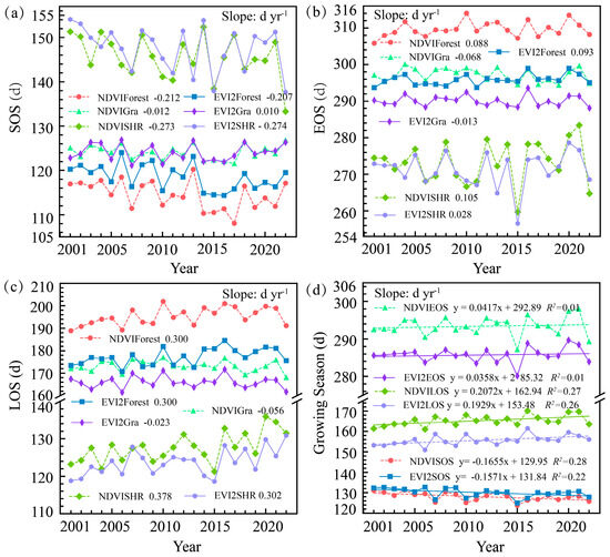 Among different vegetation types, the average LOS retrieved by NDVISDC and EVI2SDC is longest for evergreen broadleaf forests (212.62 d) and shortest for open shrublands (118.92 d) (Figure S5). From the trend analysis over time, LOS shows a shortening trend for evergreen broadleaf forests (−0.36 d yr−1), deciduous broadleaf forests (−0.08 d yr−1), grasslands (−0.10 d yr−1), and croplands (−0.62 d yr−1) (Figure S6). The vegetation type with the longest extension is deciduous coniferous forests (+0.78 d yr−1), followed by open shrubs (+0.50 d yr−1).