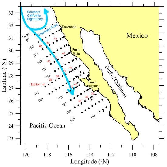 General grid of IMECOCAL stations where in situ samples were collected. The line number increases from 100 toward the south on line 137. Numbers above transects indicate station numbers, which increase with distance from the coast. The blue arrows indicate the main directions of the California Current System in the region.