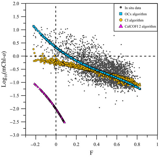 The performance of two global algorithms, OCx (Equation (12)) and CI (Equation (4)), alongside the CCS-specific CalCOFI 2 (Equation (5)), was assessed for the IMECOCAL region waters (Figure 2). All algorithms were applied to the reflectance data, yielding the logarithm of the mChl-a concentration. The results, plotted against F (Equation (2)), are shown in Figure 2. The CI algorithm exhibited greater dispersion in mChl-a estimates compared to OCx and CalCOFI 2. This is attributed to the CI algorithm’s reliance on blue, green, and red bands (Equation (3)), whereas OCx and CalCOFI 2 utilize only the blue and green bands. This means that the CI algorithm has one more input variable than the others; therefore, there is greater dispersion on the resulting mChl-a.