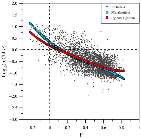 Figure 3 shows the contrast between the in situ Chl-a data and the mChl-a derived from the OCx (global) and the regional algorithm (Equation (7)). The regional algorithm mChl-a values closely mirror those of the global algorithm within the () range of blue/green reflectance ratios. For values of (), the regional algorithm estimates are approximately 1.8 mg m−3 higher than the global algorithm, which is even larger than the CI retrievals (Figure 2). Conversely, for ratios (), the regional algorithm yields lower mChl-a. Quantitatively, the regional algorithm consistently outperforms OCx, as evidenced by the SSE values for different F ranges. For the area, the OCx sum of square error, SSE, is while for the regional algorithm, it is . For the region of the chart, the SSE for OCx is and for the regional algorithm it is . This indicates that the regional algorithm yields better results than the OCx.