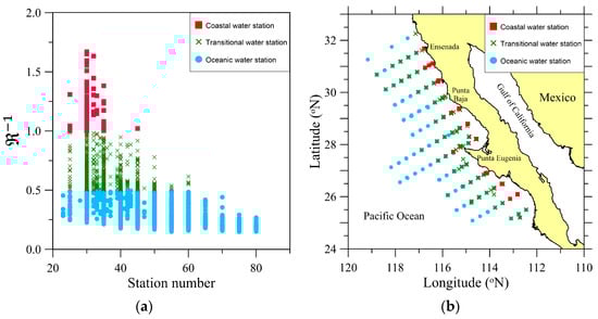 As with the latitudinal dynamic boundaries described before, coastal proximity is anticipated to influence Chlorophyll-a concentration due to various factors, including the continental outflow of inorganic matter carried hundreds of miles from the coast by Santa Ana winds [30,31] and upper layer mixing and thermocline shoaling originated by coastal upwelling, among others. These physical processes bring about nutrient enrichment in the euphotic zone and the subsequent increase of Chl-a. In order to explore the influence of near-shore coastal processes and given the correlation between station number and proximity to the coast (Figure 1), the station number was plotted against the green/blue ratio, (Figure 4a). A discernible pattern emerged with green/blue ratios higher than or equal to 1 nearer to the coast. This is likely due to the fact that these stations are nutrient-enriched and contain more Chl-a due to the photon absorption by phytoplanktonic pigments [32]. When the green/blue ratio decreases, the mChl-a concentration also decreases. This offshore trend suggests that the data could be categorized based on bio-optical properties (green/blue reflectance ratio) in three categories: coastal waters with a green/blue ratio of reflectance of 1 or higher, transitional waters with a green/blue ratio between 0.5 and 1, and oceanic waters with a green/blue ratio of 0.5 and lower. Figure 4b shows the locations of the stations according to these three categories.