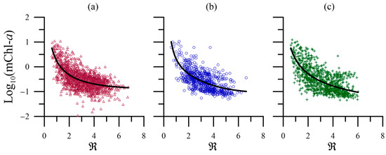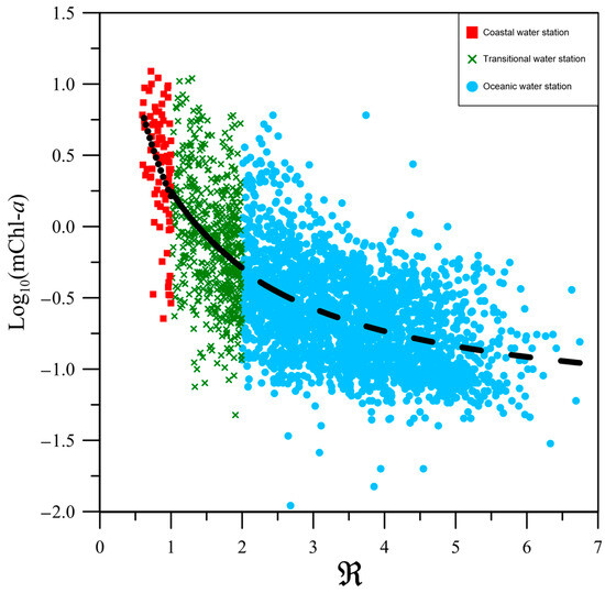 The results of these algorithms, depicted in Figure 5, align with the general data trend and closely resemble the regional algorithm (lower mChl-a prediction than OCx for coastal waters (small , large ) and higher mChl-a predictions than OCx for oceanic waters (small ). These algorithms consider the bio-optical properties of each area; coastal stations have a greater abundance of microphytoplankton (diatoms, dinoflagellates, silicoflagellates) associated with a larger phytoplanktonic absorption coefficient, whereas, in oceanic waters, smaller phytoplanktonic cells are found (nano and picophytoplankton) with smaller absorption coefficients [33]. They also offer the advantage of simpler inversion and reduced overfitting risk. The regional algorithm, on the other hand, provides a unified function for the entire range.