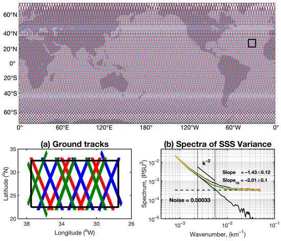 Top panel: Example pattern of Aquarius ground tracks over a 7-day period. Three radiometer beams are shown in different colors. A zoom over the area in the subtropical North Atlantic (black rectangle) is provided in panel (a). Multiple SSS ground tracks from 2011 to 2015 are collected and plotted in different colors. An example of their long-time mean SSS variance spectra is shown in panel (b). The yellow curves show the ensemble mean of the SSS variance spectrum for all beams (red, green, and blue colors), and the black curve is obtained after removing their noise, which is shown as the dashed line.