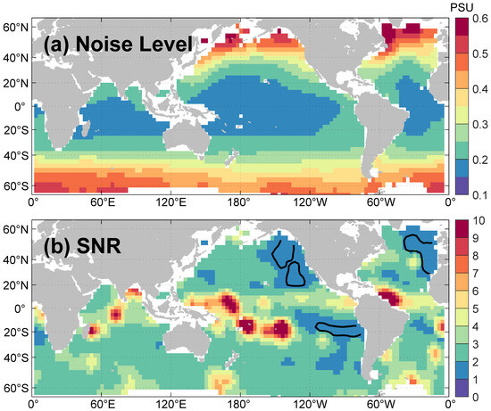 Following the techniques proposed by Xu and Fu [31], the along-track SSS wavenumber spectrum is computed in 10° × 10° spatial bins. These bins are systematically moved in 3° steps in both zonal and meridional directions across the global ocean (Figure 1). To prepare for spectral slope calculations, the time average is first removed at each footprint to obtain SSS anomalies. Within each 10° spatial bin, samples along the track are detrended to reduce energy at scales larger than half the bin size. For each spatial bin, the mean spectrum is preserved by averaging all individual spectra of each Aquarius beam (Figure 1a,b). Furthermore, the noise level is estimated by horizontally fitting the spectrum in the wavelength band of 20–25 km (Figure 1b, dashed line). This wavelength band is approximately the smallest-length scale resolved by the Aquarius. Here, the noise (e.g., Figure 1b, dashed line) is primarily instrumental white noise. The signal-to-noise ratio is defined as the ratio of the low-wavenumber signal variance to the noise variance at 20–25 km. The global-ocean noise level and the signal-to-noise ratio are shown in Figure 2. Particularly, the signal-to-noise ratio ranges from 1 to 10 at a 180 km wavelength; because of this high ratio, the subtraction of noise from the mean spectrum (Figure 1b, yellow curve) makes the SSS variance spectrum largely unaffected at low wavenumbers (Figure 1b, black curve).