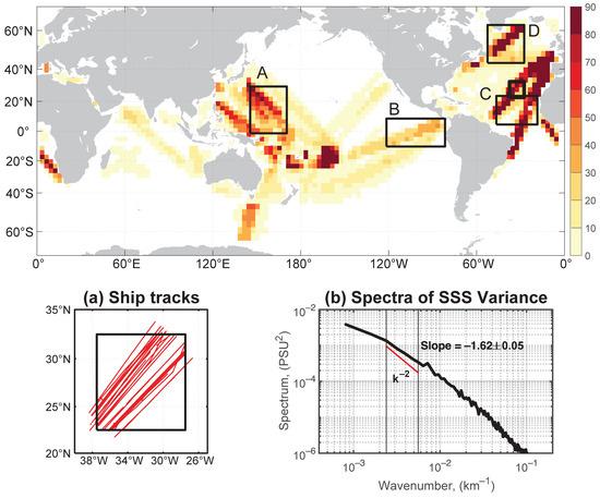 High-resolution TSG data are used to estimate the wavenumber spectra of SSS variability in a few selected areas. The choice of the areas is dictated by the availability of data. Specifically, we analyze the TSG data in four designated boxes (Boxes A–D in Figure 3). To ensure robust analysis, relatively straight segments of ship tracks are analyzed, comprising a minimum of 20 segments in each box, with each segment spanning 1200 km or longer (Figure 3a). The approach employed to estimate the wavenumber spectra from the TSG data follows the approach used to analyze the Aquarius ground-track data (see Figure 1b and Figure 3b, black curves). This consistent approach allows for a comparative analysis of SSS variability across different datasets, enabling insights into regional and global patterns of SSS dynamics.