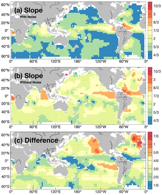 The global distribution of the SSS spectral slope is shown in Figure 4. The slope differences between with (Figure 4a) and without noise (Figure 4b) are relatively large (>5/6) in the Eastern North Pacific, the Southeastern Tropical Pacific, and the Northern Subpolar Atlantic (Figure 4c). In the vast extratropical oceans (poleward from the 20° latitudes), after the removal of noise, the spectral slope hovers about −2, (Figure 4b, light green), with a slope bias of approximately ±1/6 (Supplementary Materials Figure S3). This −2 slope agrees with the tracer variance spectral slope predicted by the SQG turbulence theory in the inverse cascade range of depth-integrated energy [36]. Nonetheless, notable deviations are observed, particularly over the Northern Pacific and Northern Atlantic Oceans, where a steeper slope of −7/3 prevails. In these regions, the signal-to-noise ratio (Figure 2b, blue) is very low (less than 2) at wavelengths below 180 km; then, due to the removal of noise, less variance is accounted for at smaller wavelengths in calculating the spectrum, thus causing a steeper slope.