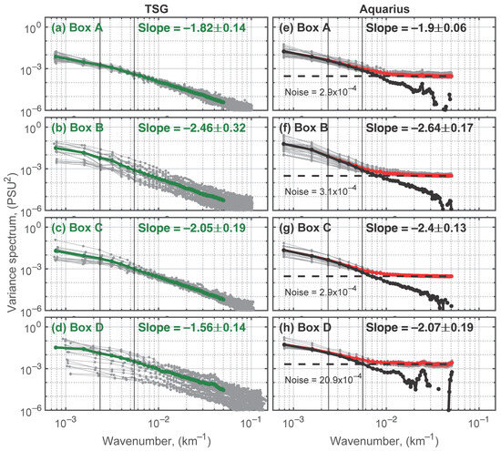 Wavenumber spectrum of SSS calculated from (a–d) TSG data and (e–h) Aquarius SSS datasets. For TSG data, the gray curves show individual wavenumber spectrum, and the green curves show their regional averages. For Aquarius data, the red curves show the regional averages, and the black curves show the spectrum without noise. The locations of the boxes are shown in Figure 3 by the black rectangles.