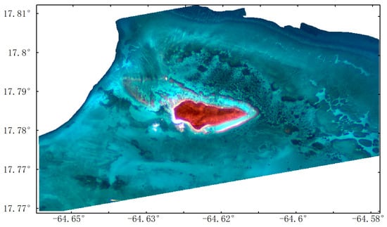 where  and  are the reflectance at  and , respectively.  and  are the attenuation coefficients of the water column at  and , respectively. The entire shallow sea around Oahu Island and Buck Island is clear, and the marine environment is minimally affected by human activities; therefore, a homogeneous water column is assumed. Based on this assumption, the attenuation coefficient ratio  will be a constant [].  = 0.68 was set for this paper.