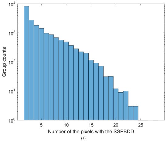 B2, B3, and B4 of Sentinel-2 images are usually used for depth inversion models [,,]. Figure 5 and Figure 6 show the statistics diagram of pixels with the SSPBDD for three-band spectral profiles on Buck Island and Oahu Island, respectively. For example, the value 5 on the X-axis in Figure 5a indicates that the spectral profiles of the 5 pixels in a group are the same; thus, 5 is the number of pixels with the SSPBDD in a group, and the corresponding value 1443 on the Y-axis indicates that there are 1443 groups and there are 5 pixels with the SSPBDD in each group. To study whether those pixels with the SSPBDD are related to water depth, Figure 5b and Figure 6b show histograms of the measured depths corresponding to those pixels. Similarly, the maximum depth difference of pixels with the SSPBDD represents the maximum of difference among water depth among the pixels with the SSPBDD in a group. Figure 5c and Figure 6c show histograms of the maximum depth difference of pixels in each group; then, Figure 5d and Figure 6d show the spatial distribution of those pixels with a maximum depth difference greater than or equal to 1.5 m.
