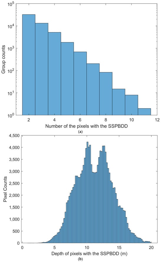 Figure 5a and Figure 6a show the shapes of the histograms for Buck Island and Oahu Island are similar: they both decrease gradually, but the trends are slightly different. For example, there are 1840 groups when 5 pixels have the SSPBDD and only 8 groups when 10 pixels have the SSPBDD on Buck Island; 1443 groups when 5 pixels have the SSPBDD; and 489 groups when 10 pixels have the SSPBDD on Oahu Island. In addition, the maximum number of pixels with the SSPBDD is 11 for Buck Island in one group, while the maximum number of pixels with the SSPBDD reaches 24 for Oahu Island in one group. Table 2 shows that although the percentage is lower on Oahu Island than on Buck Island, the SSPBDD phenomenon is more significant due to a greater number of pixels with the SSPBDD on Oahu Island. The histograms in Figure 5b and Figure 6b both closely resemble a Gaussian shape, which means that the SSPBDD phenomenon mainly occurs at water depths of 5–15 m. In addition, they show that the probability of the SSPBDD phenomenon is relatively low in depths of 0–5 m, possibly because the effect of the seafloor on remote sensing reflectance is more significant at depths of 0–5 m than at other depths, since Figure 3b shows that there are many more pixels at 0–5 m, so this may be the reason why the percentage is lower on Oahu Island than on Buck Island in Table 2, meaning that percentage of pixels with the SSPBDD is related to water depth. Figure 5c and Figure 6c show that the count of groups decreases sharply as the maximum depth difference increases, reaching maximum water depths of 11 m and 13 m, respectively, where only a very small number of groups are present. Figure 5d and Figure 6d show only 65,240 pixels with a depth greater than or equal to 1.5 m and 15,055 pixels with a maximum depth difference greater than or equal to 5 m for Oahu Island, and there are 55,707 pixels with a maximum depth difference greater than or equal to 1.5 m and 1605 pixels with a depth greater than or equal to 5 m for Buck Island. Referring to Figure 3a and Figure 4a, the distributions of these pixels can be summarised as follows: most pixels are in the lagoon areas and at 5–15 m depth on the two islands, in the tidal channel on Oahu Island, and near the image boundary on Buck Island.