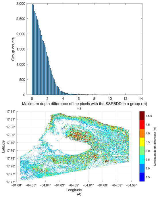 Histogram and the spatial distribution of pixels with the SSPBDD on Buck Island. (a) histogram of number of the pixels with the SSPBDD in a group, Pixels with the same spectral profile form a group. (b) histogram of depth of pixels with the SSPBDD. (c) histogram of maximum depth difference of the pixels with the SSPBDD in a group. (d) the spatial distribution of the pixels with the SSPBDD, only pixels with a maximum depth difference greater than or equal to 1.5 m.