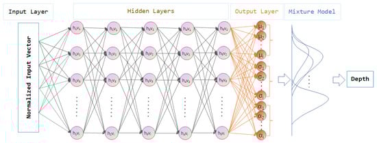As shown by the Fourier transform, a complex signal can be obtained by combining multiple sinusoidal or cosine signals of different frequencies. Similarly, a complex probability distribution can be obtained by combining multiple simple probability distributions. If the multispectral signal corresponding to a pixel is not a depth but rather a probability distribution of depth, the one-to-many mapping problem of depth-multispectral data can be solved. This method, that is, the mixed density network, was first proposed by Christopher Bishop in the 1990s []. Through it, the prediction output of the neural network is no longer a single value but rather the weighted sum of multiple Gaussian distributions with different means and variances.