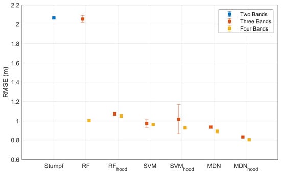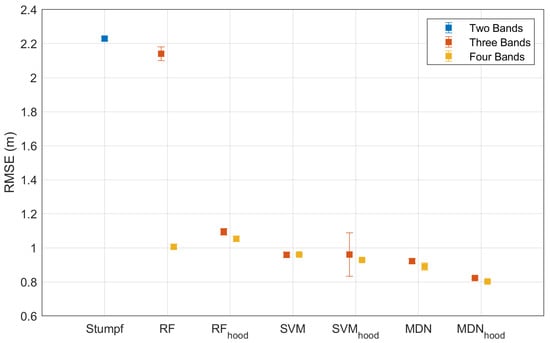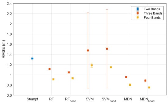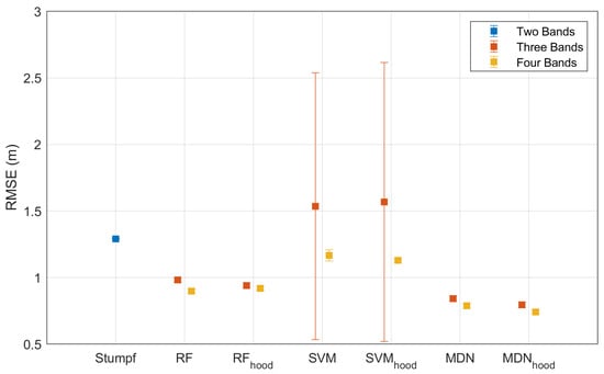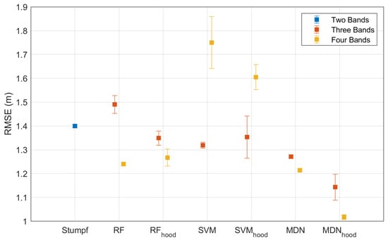 Error bars of models with different band combinations for Oahu Island. The blue marker represents two-band only for Stumpf model; the red markers represent three-band (Equation (5), or Equation (7)); the yellow markers represent four-band (Equation (6), or Equation (8)). To avoid overlap, three-band marker and four-band markers are located on each side of gridlines corresponding to the label of the model’s name. There are some markers, e.g., the blue marker of the Stumpf model, the three-band and the four-band marker of the MDN model, for which the error bars are unclear, i.e., standard deviation of RMSE is very small. Error bars of three-band model of SVM and SVMhood is exceptionally large, which denotes the standard deviation of their RMSEs are very big. The representations in Figure 9, Figure 10, Figure 11, Figure 12 and Figure 13 are similar.