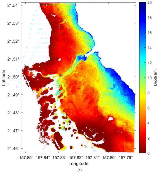The measured depths used in this study were all derived from airborne LiDAR data obtained from the public dataset of the National Oceanic and Atmospheric Administration (NOAA) Coastal and Ocean Science Centre. The measured depths for Oahu Island (Figure 3a; only 0–20 m depth is shown) consist of irregularly spaced points with an average point spacing of approximately 4 m. The horizontal positioning accuracy is about 3 metres, and the vertical accuracy is about 0.15 m. The measured depths for Buck Island (Figure 4a; only 0–20 m depth is shown) consists of LiDAR points with a spacing of 3 m × 3 m. The vertical and horizontal accuracies of the measured depths meet the requirements of the 1st-order measurement accuracy defined in the 5th edition of the International Hydrographic Organization (IHO) standards [], with a vertical positioning uncertainty less than [0.52 + (0.013 × depth)2]1/2 metres and a horizontal positioning uncertainty less than (5 + 0.05 × depth) metres. Notably, there are a few scattered blank areas in the measured depths for Buck Island, but this does not affect the overall training or depth inversion. Only water depths within 0–20 m are considered for depth inversion in this paper.