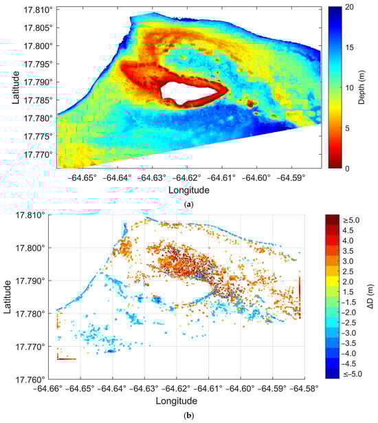 Inversion depth imagery (a) and only the pixels with  (b) for Oahu Island. Only 0–20 m water depth is shown, other depths are left blank for (a). To show more clearly where the pixels with larger errors are located, only  is plotted, and others are blank in (b). The representation in Figure 13 is similar.