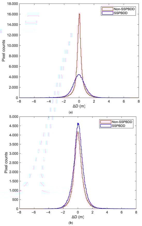 Histogram of ΔD with the SSPBDD pixels and ΔD with the non-SSPBDD pixels for Oahu Island (a) and Buck Island (b).