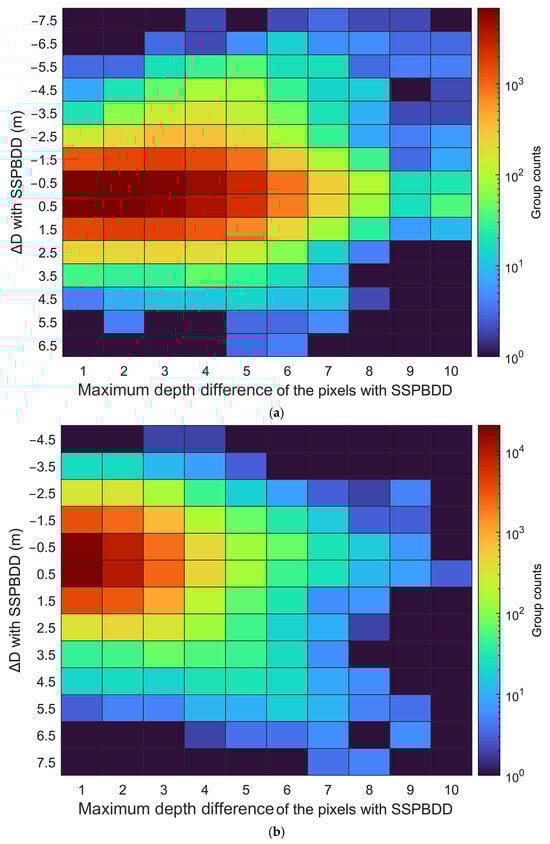 Heatmap of the number of pixels with the SSPBDD in a group for Oahu Island (a) and Buck Island (b), respectively. It denotes the relationship between ΔD and number of the pixels with SSPBDD in a group, most of which are inversely proportional.