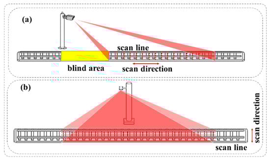 Most research on railway obstacle intrusion focuses on visual detection [4]. However, current optical systems face several challenges, including susceptibility to lighting conditions; reduced obstacle recognition in harsh environments such as rain, snow, and fog; and difficulty in accurately identifying the distance information of obstacles [5]. Staniša et al. [6] proposed a machine learning-based strategy for obstacle detection in cases of pixel-level differences to overcome the low-pixel resolution of the camera system under adverse environmental conditions. Meanwhile, Anand et al. [7] introduced a visual enhancement system that combines infrared cameras and other devices to improve its detection rate in adverse weather conditions. Lidar is an active sensor. It emits laser pulses towards an object and calculates the distance by collecting and analyzing the echo signals reflected from the object. In recent years, lidar sensors have been widely used in obstacle detection because they are immune to environmental light, have a quick response time, and effectively detect distant obstacles [8,9]. The mainstream 3D lidar used in obstacle measurement includes MEMS (Micro-electro Mechanical System) lidar and traditional mechanical lidar. Due to the faster scanning speed, MEMS lidar is used more for dynamic obstacle detection. Zheng et al. [10] combined 2D MEMS lidar with drones to calibrate coordinates on sparse point cloud maps. They utilized a clustering algorithm to detect obstacles in motion. MEMS lidar uses voltage to drive a two-axis MEMS mirror to realize scanning in a three-dimensional direction [11]. When we use it to detect railway obstacles, the scanning method, as shown in Figure 1a, is usually adopted to realize remote detection. However, this method will bring the scanning of blind areas. Traditional mechanical lidar uses a motor to carry the single-line lidar to realize three-dimensional scanning. It can achieve a denser distribution of scan lines by slowing down the motor speed, so the imaging detail is outstanding (Figure 1b). Vitor et al. [12] performed the output of 3D point clouds by combining 2D lidar and inertial measurement units along the railway. They completed the detection of railway obstacles in the small crossing area.