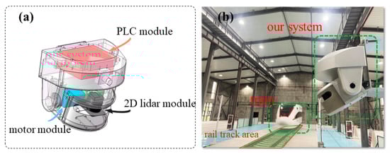 As shown in Figure 2a, the hardware components of the entire system include a 2D scanning lidar rangefinder, a high-precision servo motor, and a PLC. The design and implementation of the 2D lidar rangefinder are not within the scope of this article’s discussion, and it achieves scanning along the lateral line using fixed angular resolution. The servo motor carries the 2D lidar to realize the acquisition of 3D information.
