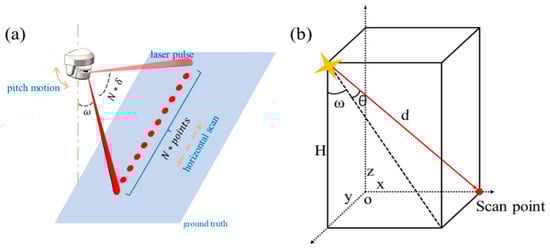 In this set of equations, represents the fixed angular resolution of the 2D lidar. and represent the horizontal scanning angle and actual pitch angle of the i-th scan pulse on the j-th scanning line from the beginning, respectively. Meanwhile, represents the starting pitch angle of the j-th scan line, whereas refers to the angle compensation for the scan pulse at that point and n represents the total number of scan points for the j-th scan line. When the lidar moves upwards, it takes a positive value; when it moves downwards, it takes a negative value.